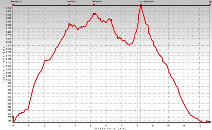 Travesía realizada desde Nª Sra. de Ocón (756 m.) en Bernedo (Alava) por el cordal de la Sierra de Cantabria hasta la Cruz del Castillo (1.432 m.), pasando por San Tirso (1.329 m.) y Peña del León (1.394 m.) para finalizar en el pueblo de Lagrán (Alava).